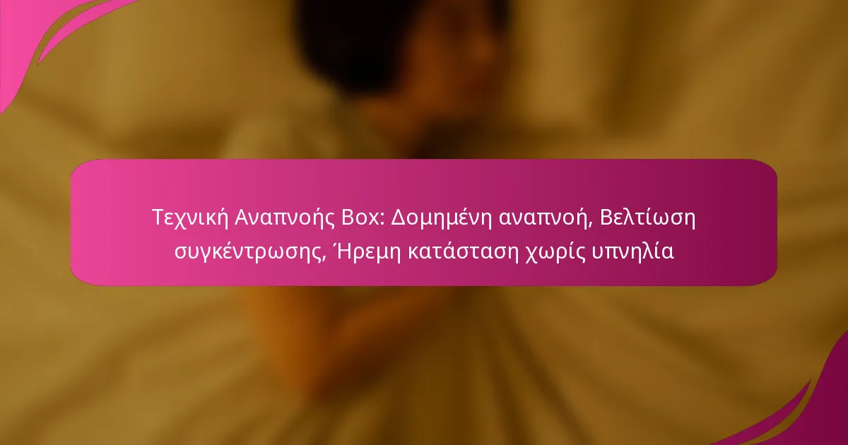 Η αναπνοή σε κουτί είναι μια δομημένη τεχνική που περιλαμβάνει τέσσερα ίσα μέρη. Ξεκινήστε εισπνέοντας από τη μύτη σας για μια μέτρηση τεσσάρων. Κρατήστε την αναπνοή σας για άλλη μια μέτρηση τεσσάρων. Εκπνεύστε αργά από το στόμα σας για μια μέτρηση τεσσάρων, στη συνέχεια κρατήστε την αναπνοή σας ξανά για τέσσερις μετρήσεις. Επαναλάβετε αυτόν τον κύκλο για αρκετά λεπτά, διατηρώντας έναν σταθερό ρυθμό για να προάγετε τη χαλάρωση.